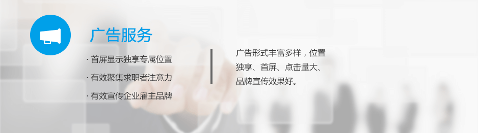廣告服務(wù)基于龐大的網(wǎng)絡(luò)平臺,位于首屏,企業(yè)客戶可以在首頁擁有專享位置,被推薦的職位和公司始終占據(jù)求職者的第一視線,極大地聚焦求職者的注意力,從而大幅度提升招聘職位的關(guān)注度、點擊量及招聘效果。廣告有知名企業(yè)招聘、熱點招聘、品牌招聘、搜索置頂、海報等多種類型。企業(yè)客戶可根據(jù)招聘需求選擇合適的廣告類型,完成招聘需求。